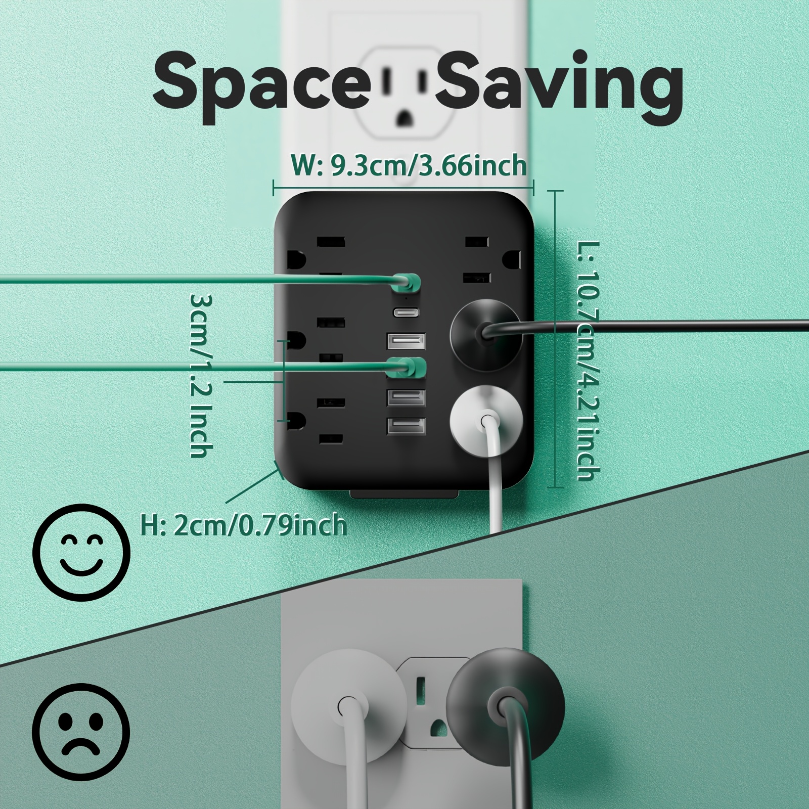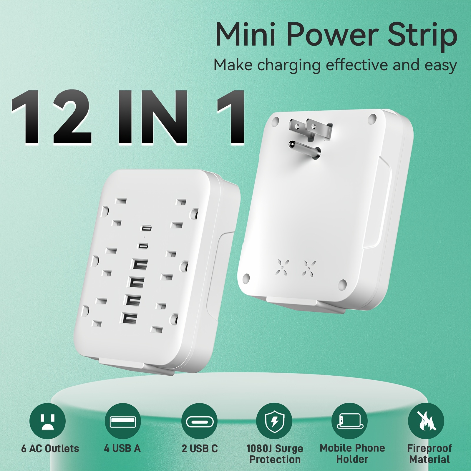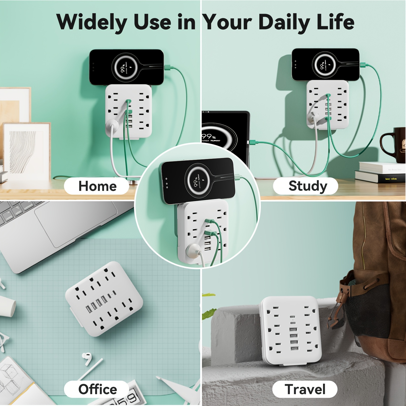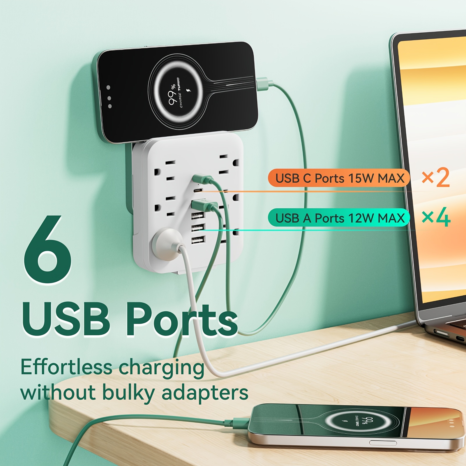Wall Charger with 6 Outlets & 6 USB Ports (4 USB-A + 2 USB-C) Surge Protector Power Strip, Multi Plug Adapter with Spaced Design, Compact and Travel-Friendly for Home, Travel, and Office