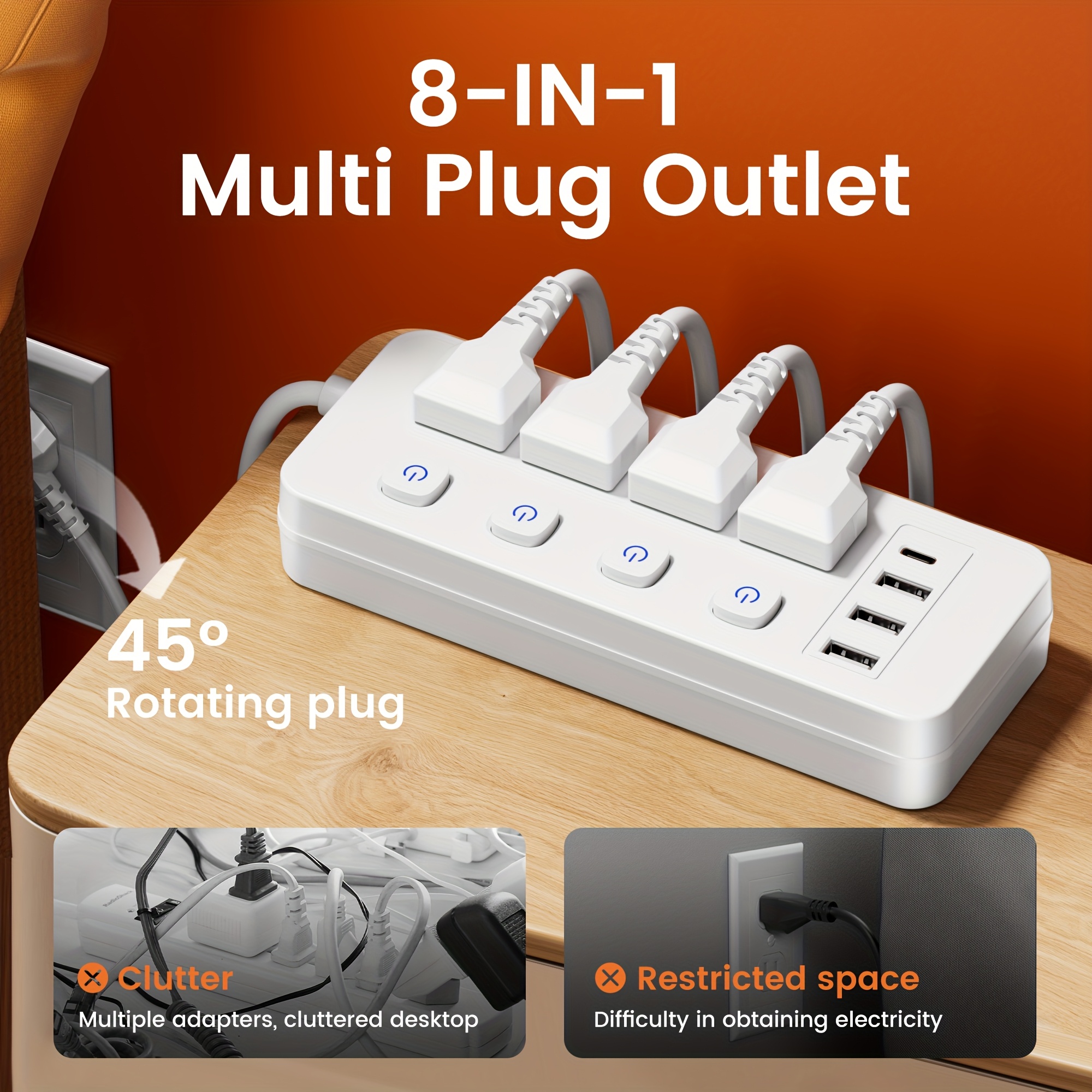 1pc Multi-Outlet Power Strip With Surge Protection And Switch - 4 AC Outlets With Switch, 3 USB-A Ports And 1 Type-C Port And 5 FT/10 FT Extension Cord - For Office, Study, Home, And School Use - With Overload Protection